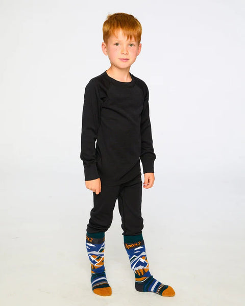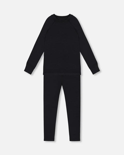 Designed to be worn underneath a snowsuit, these essential base layers make every moment on the mountain warmer and more comfortable. In soft merino jersey, this two-piece thermal underwear set features a long raglan sleeve top with a round neckline and a pull-on pant with a stretch elastic waistband.